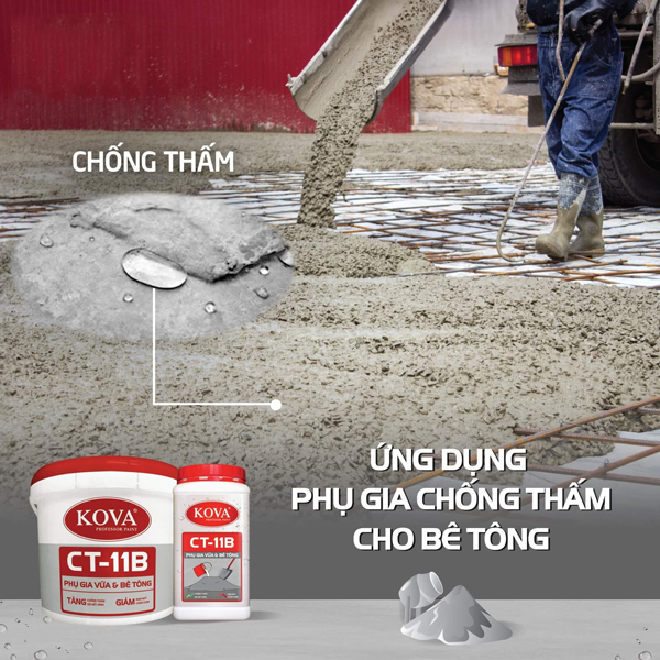 - Chất phụ gia chống thấm vữa & bê tông KOVA CT-11B là phụ gia dạng lỏng được cho vào vữa xi măng, bê tông giúp làm tăng độ linh động, khả năng biến dẻo và khả năng chống thấm, đồng thời làm giảm khả năng rạn nứt của bê tông.