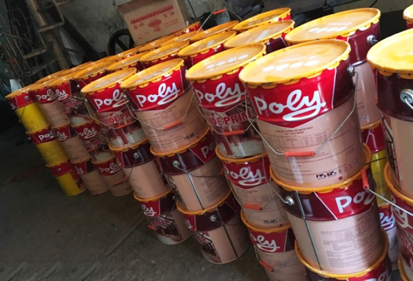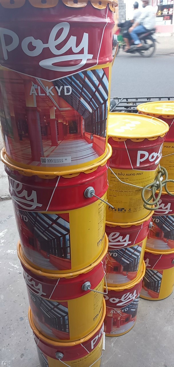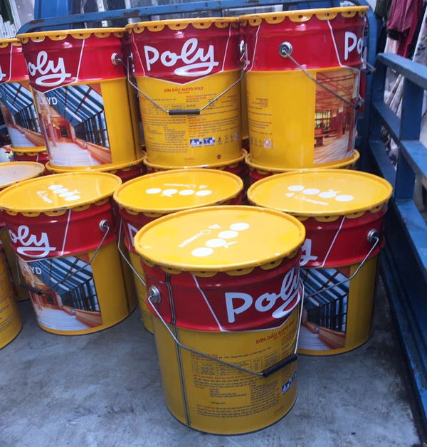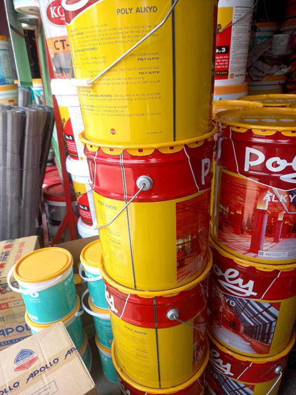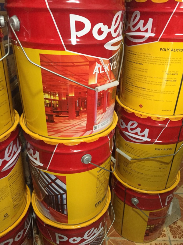 - Để pha loãng sơn có thể dùng dung môi xylene, toluene hoặc dầu hỏa. Sơn dầu alkyd Poly có thùng 18 lít, các lon 3 lít, 375ml và 800ml.