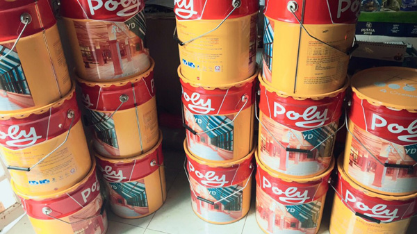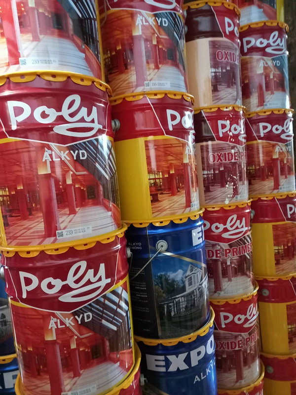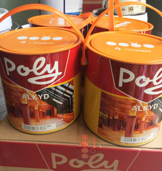 - Để pha loãng sơn có thể dùng dung môi xylene, toluene hoặc dầu hỏa. Sơn dầu alkyd Poly có các lon 3 lít, 375ml, 800ml và thùng 18 lít.